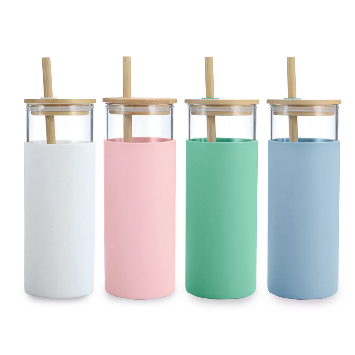 כוס זכוכית , חבק סיליקון ,עם מכסה במבוק וקש.