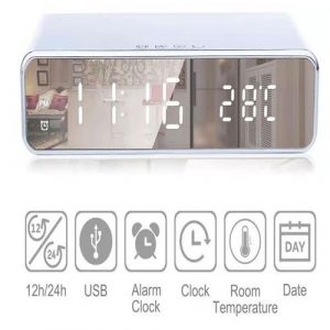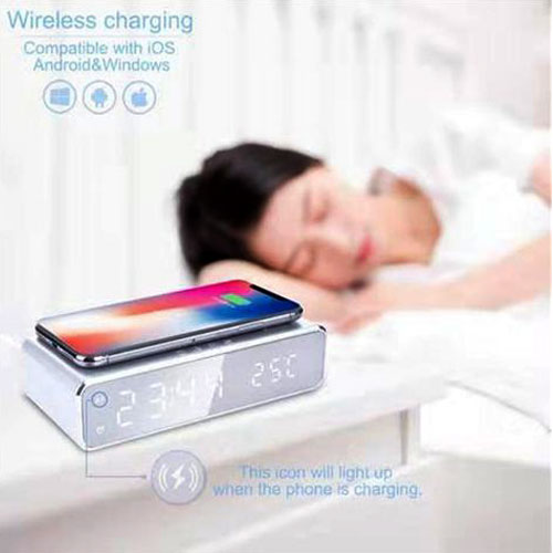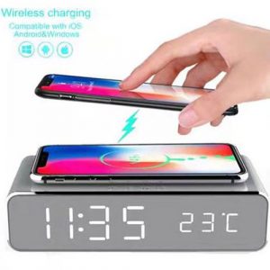 משטח טעינה אלחוטית בעוצמה של 10W משולב בשעון דיגיטלי המראה גם טמפרטורה ותאריך