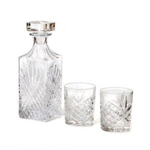 מארז עץ ובתוכו סט ויסקי הכולל שתי כוסות ובקבוק מזיגה מהודר