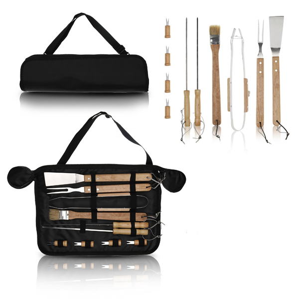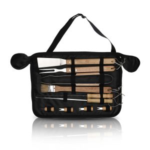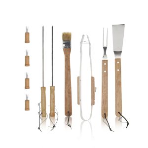 הסט כולל: תרווד , מזלג , מלקחיים ,מברשת ,2 שיפודים ,4 דוקרנים